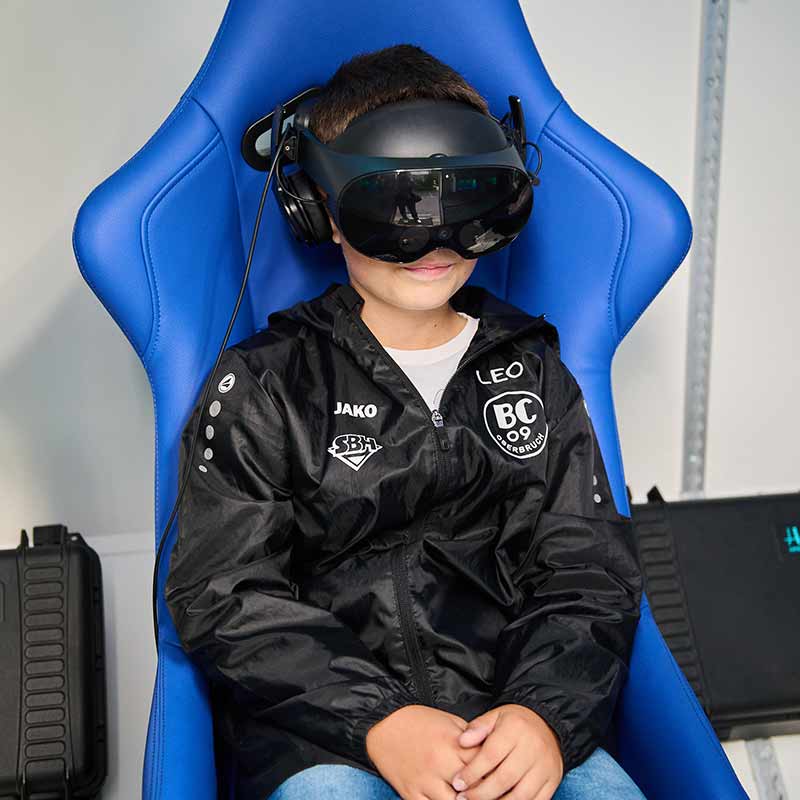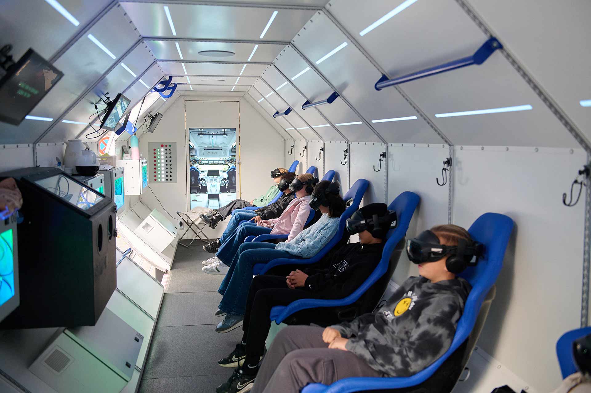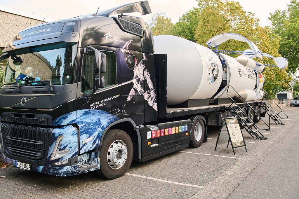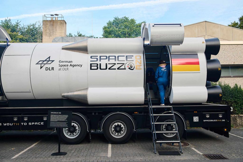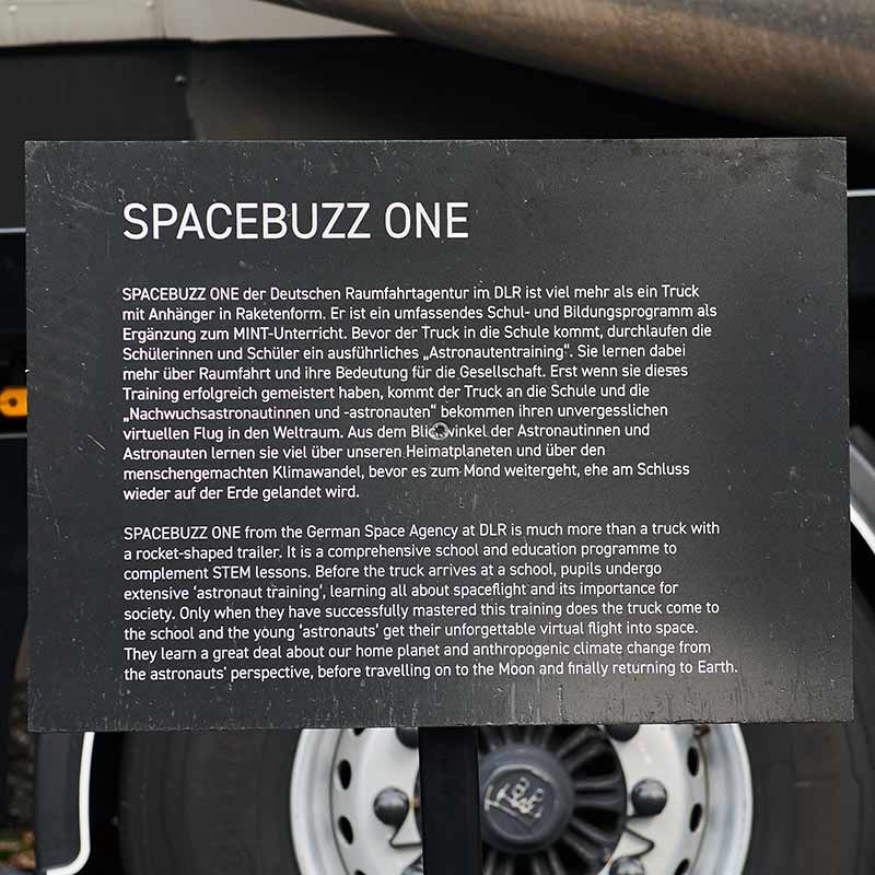Der SPACEBUZZ ONE der Deutschen Raumfahrtagentur im DLR ist ein begehbarer High-Tech-LKW, der äußerlich einer liegenden Rakete ähnelt und im Inneren VR-Technologie im Weltraumdesign beherbergt. Sie werden auf den beweglichen Sitzen Platz nehmen, eine VR-Brille aufsetzen und einen virtuellen Raumflug ins All erleben. Die Zuschauer verlassen für 15 Minuten unsere Erde und umkreisen sie. Aus dem Blickwinkel der Astronautinnen und Astronauten lernen sie viel über unseren Heimatplaneten und über den menschengemachten Klimawandel, bevor es zum Mond weitergeht, ehe am Schluss wieder auf der Erde gelandet wird.
